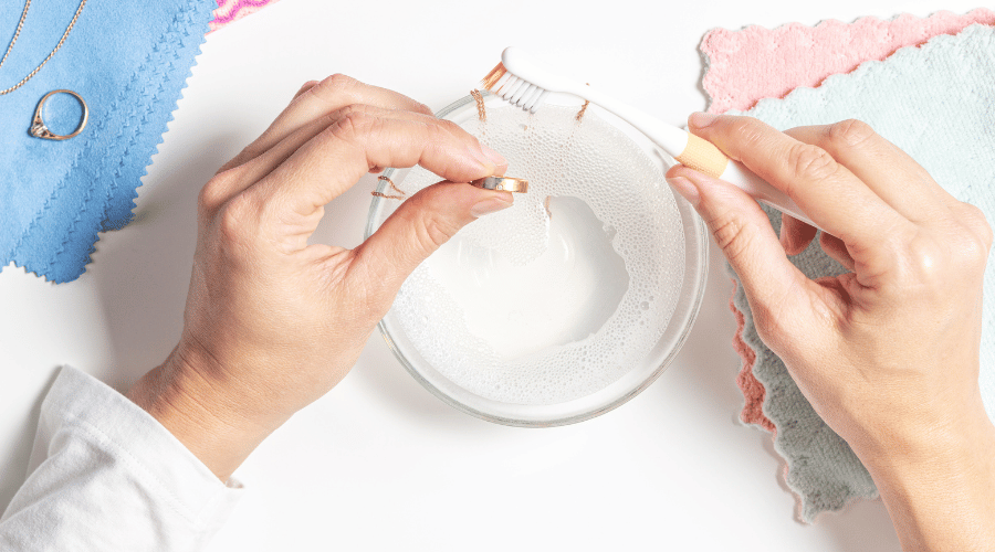 - Gently scrub the jewelry with a soft brush to remove any oxidation.